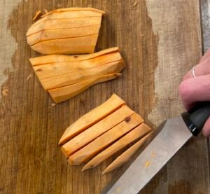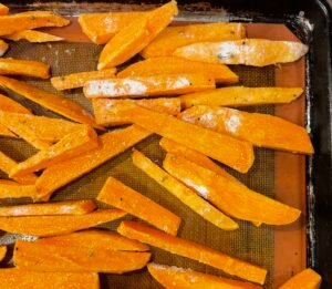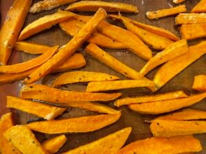 Peel the sweet potatoes then slice in ¼ inch strips. Place in a large bowl. Add the avocado oil and stir to coat each slice. Sprinkle the cornstarch over the potatoes and lightly stir to coat all of them.