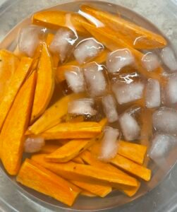 Feel free to skip the step of soaking the sweet potatoes in salted ice water. This step doesn't make a huge difference--I found that they were still crunchy with just the cornstarch added. It will save time in the process.