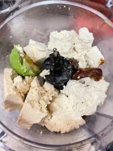 Remove the avocado pit and then scrape the flesh into the food processor. Drain the tofu and add it to the food processor. Add the remaining ingredients to the food processor.