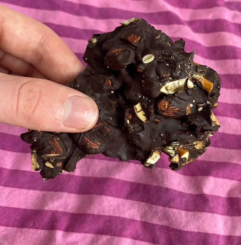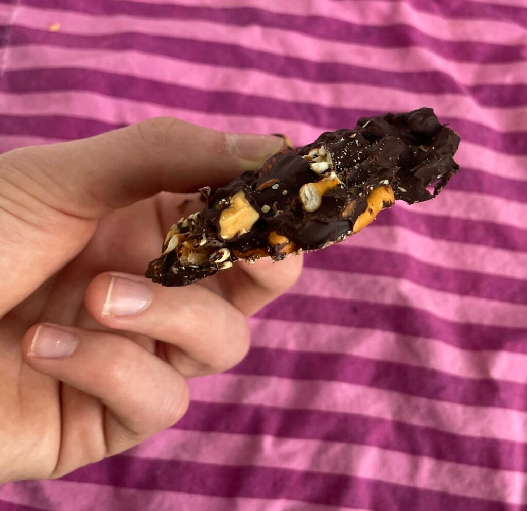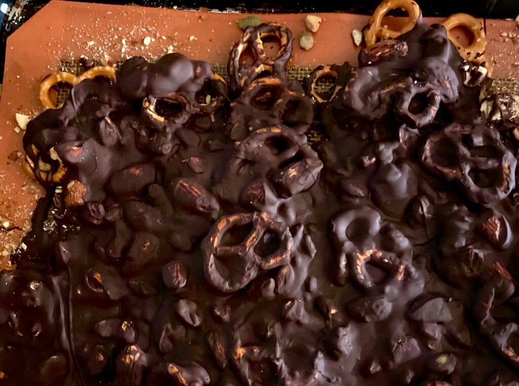 This recipe is a fun way to help young and not so young children make healthy treats. My 15-year-old son wanted to make a crunchy chocolate bark using pretzels–he was craving the salty crunch. So we bought some gluten-free pretzels and away he went–using the pretzels plus almonds and pumpkin seeds. In the end, he was very excited about his flavor combination. This recipe is so adaptable and can be made with all sorts of fun combinations. Try your own for fun!
