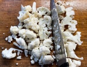 Dice the potatoes, cauliflower, and carrots into cubes and then add to the pot. Saute until covered with the spices.