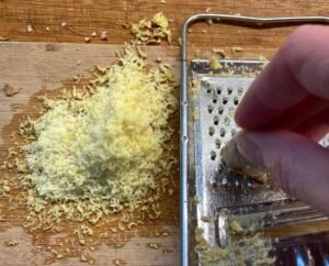 Grate the ginger, then add the ginger and all of the spices to the onions and garlic. Saute for one minute.